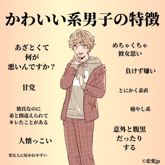 かわいい系男子の特徴とは? 外見や性格がまるで女子のように愛らしい男子が「かわいい系男子」です。見ているだけで癒される女子も多いでしょう。 童顔でかわいいタイプだけでなく、おしゃれできれいなタイプの男子もいます。 センスのよい髪型・ファッション ふんわりとした系男子一覧がイラスト付きでわかる! Pixiv内における「 系男子」の一覧。 一覧 この記事は書きかけです。気が付いた方は随時追加をお願いします。 なお、タグとして機能している物のみ追加してください。 ^草食系男子穏やかで恋愛に対してガツガツしていない男性。系男子の種類を一覧で紹介 肉食系男子や草食系男子など男子をカテゴライズするようになったが、今では様々な 系男子が登場するようになっており、今もまた常に新しいカテゴリーの男子が登場している。 草食系男子